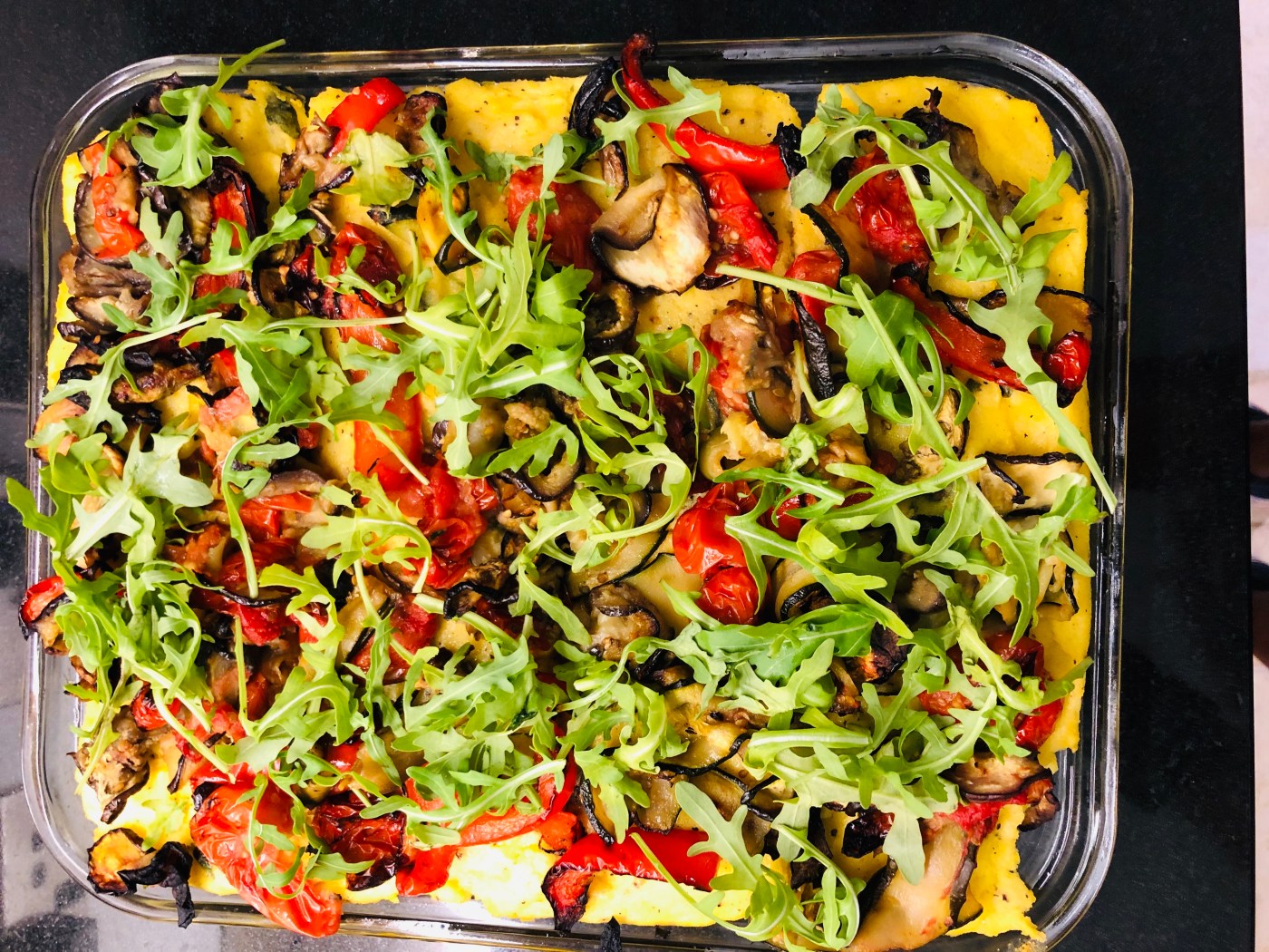 - Brush vegetables with olive oil, season with salt and pepper, and grill until tender. Spread the vegetables on top of the polenta, scatter the rocket leaves on top.